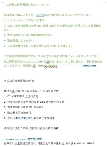 「控訴人の訴状に署名し、中国語と日本語の両方で読んだ後、訴状に記載されているウェブサイトにアクセスしました。訴状の1ページ目(下記スクリーンショット#001参照)で、控訴人は訴訟費用の支払いについて言及し、裁判所職員から訴訟費用の支払い方法について指示を受けたいと希望していました。しかし、東京地方裁判所は控訴人に対し、訴訟が受理されたかどうかも、棄却されたかどうかも明らかにせず、訴訟費用の支払い方法や支払い時期についても何も指示しませんでした。裁判所の担当官にこの件について説明を求めてください。」